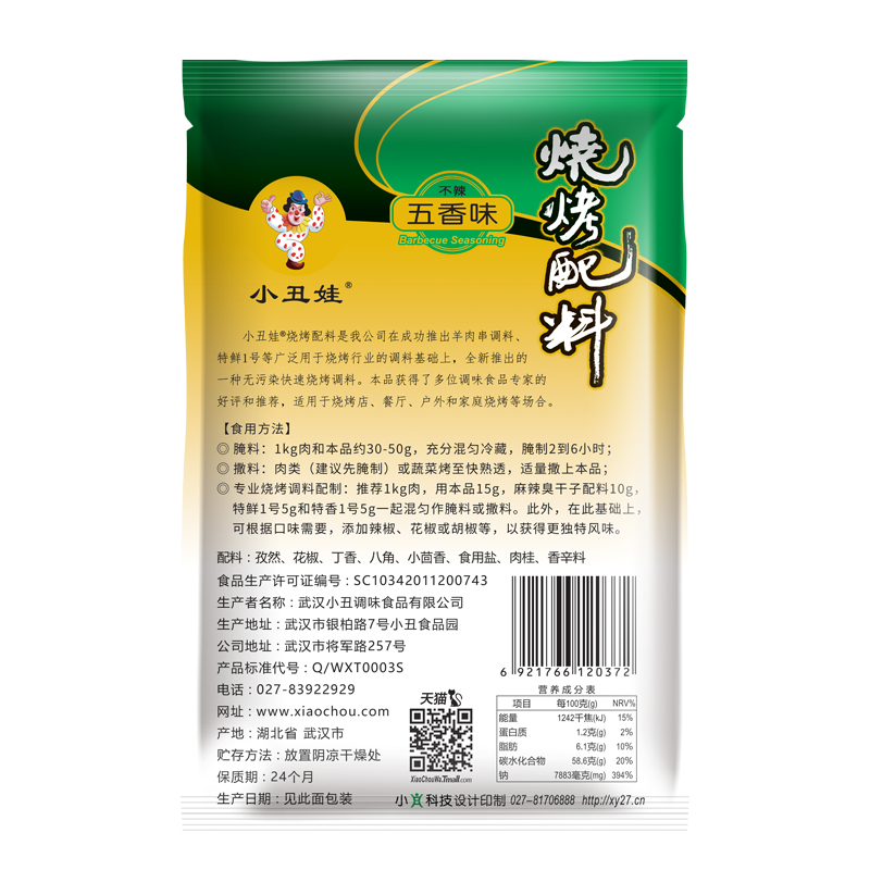 淘宝购买(小包装) 天猫购买(小包装) 淘宝购买(整箱20袋) 参数规格 净含量 454 g 保质期 24 个月 配料表 孜然、花椒、丁香、八角、小茴香、食用盐、肉桂、香辛料 条形码(小包装) 6921766120372 整箱货号&规格 XC20372A:454gX20袋 您也可以看看: 40g烧烤撒料 454g多效腌料鲜香微辣味 45g麻辣臭干子配料 << 返回列表